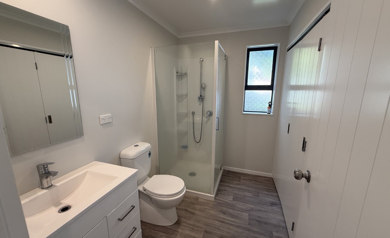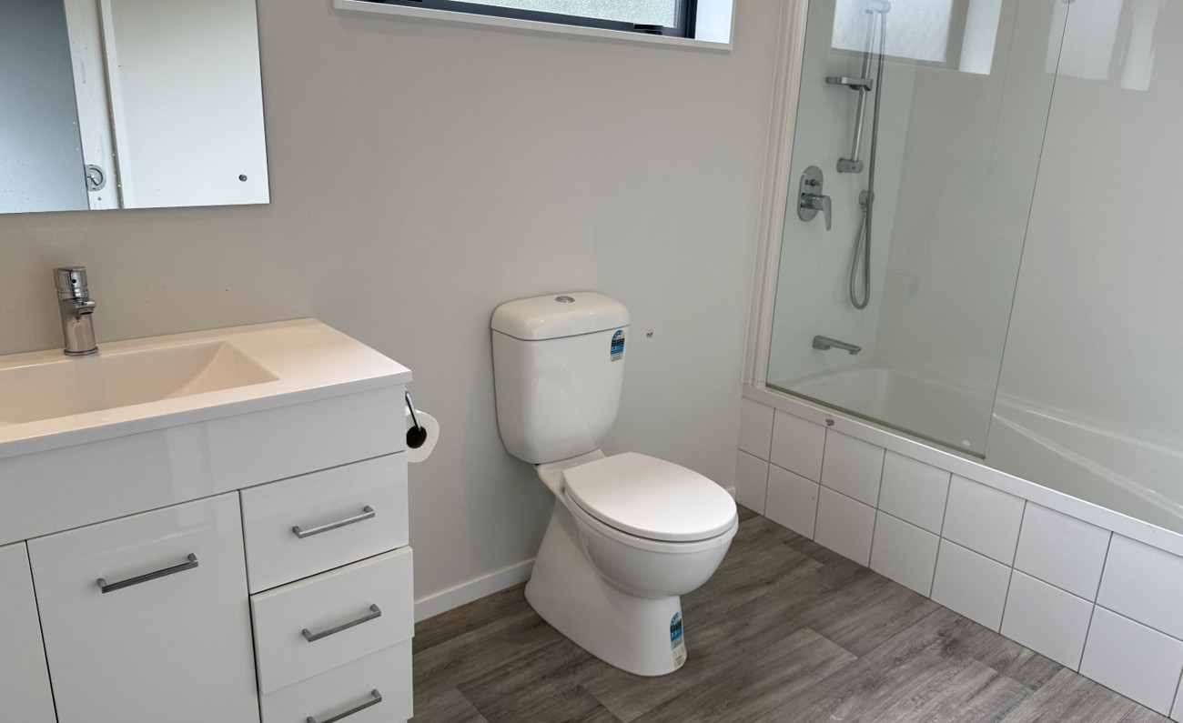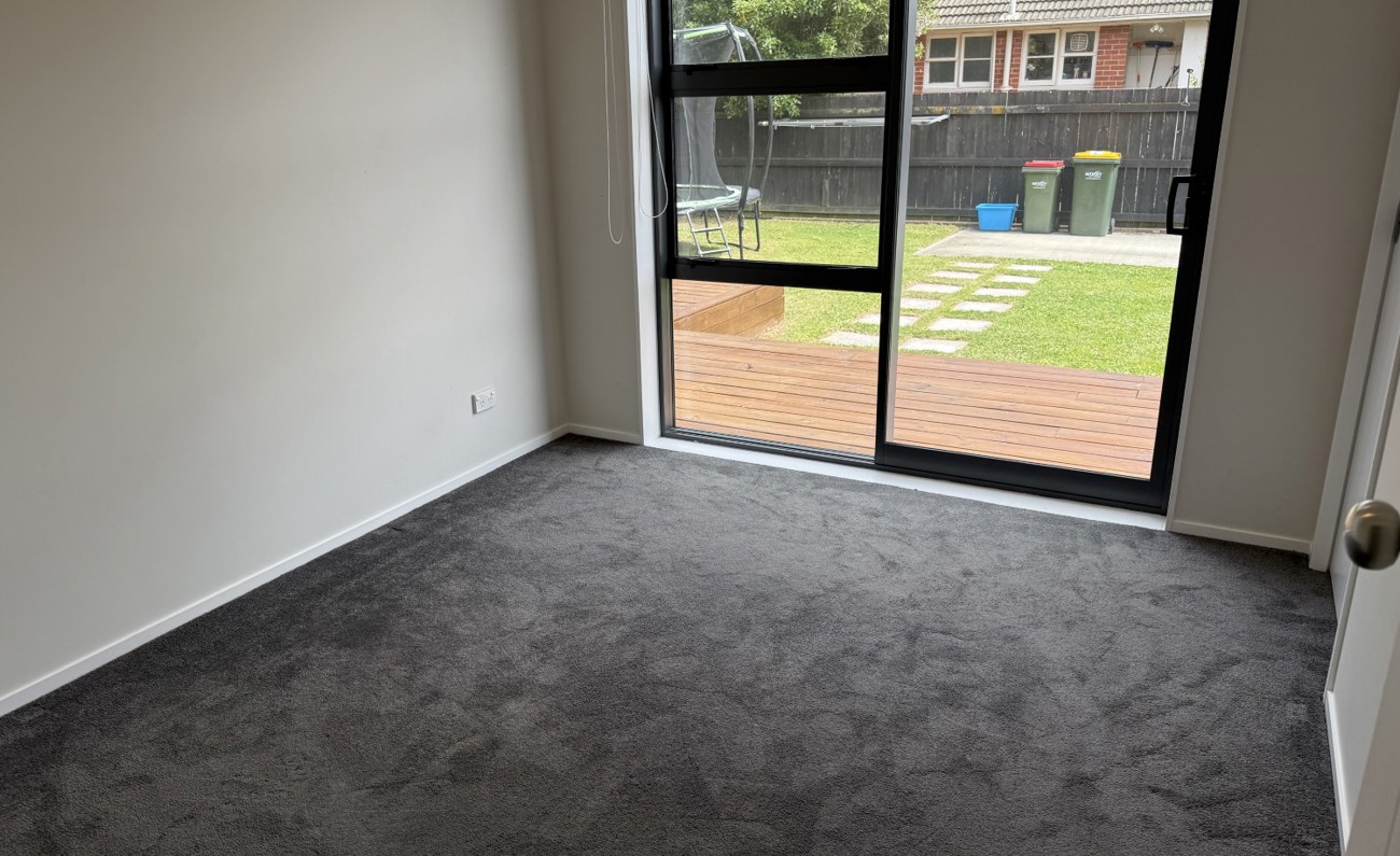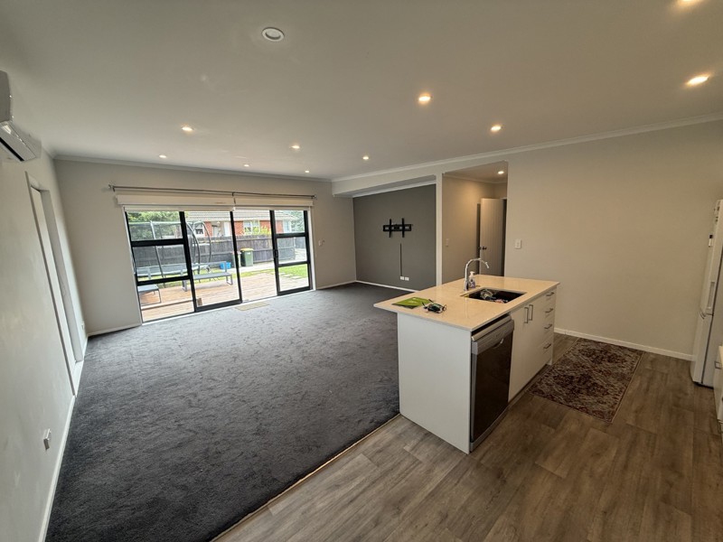 The open-plan kitchen flows seamlessly into the sunny living area, kept comfortable year-round with a heat pump. Sliding doors open to a private courtyard — ideal for relaxing or entertaining guests.