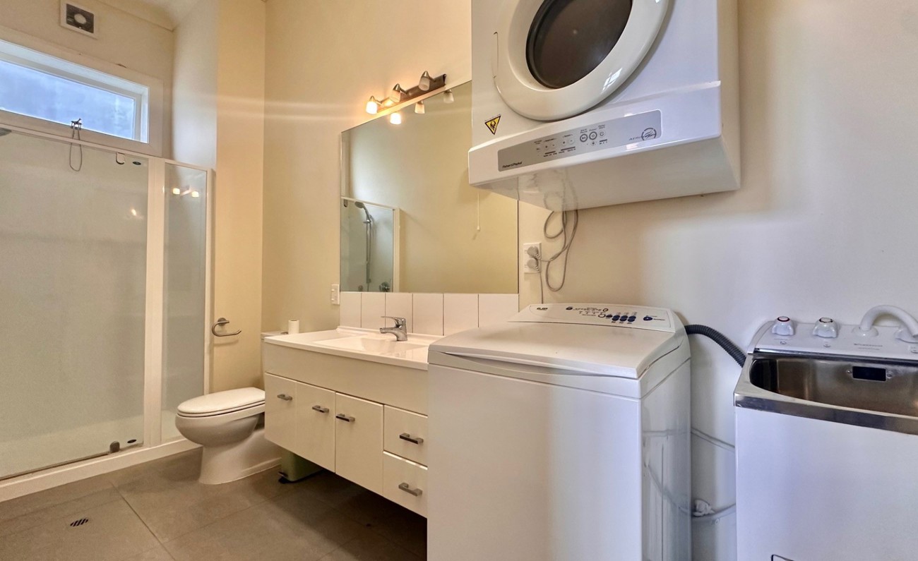 Modern bathroom with vanity, shower, toilet and combined with laundry which has a tub, washing machine and dryer included.