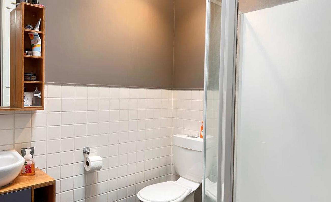 The bathroom has a shower, vanity, heated towel rail and toilet.