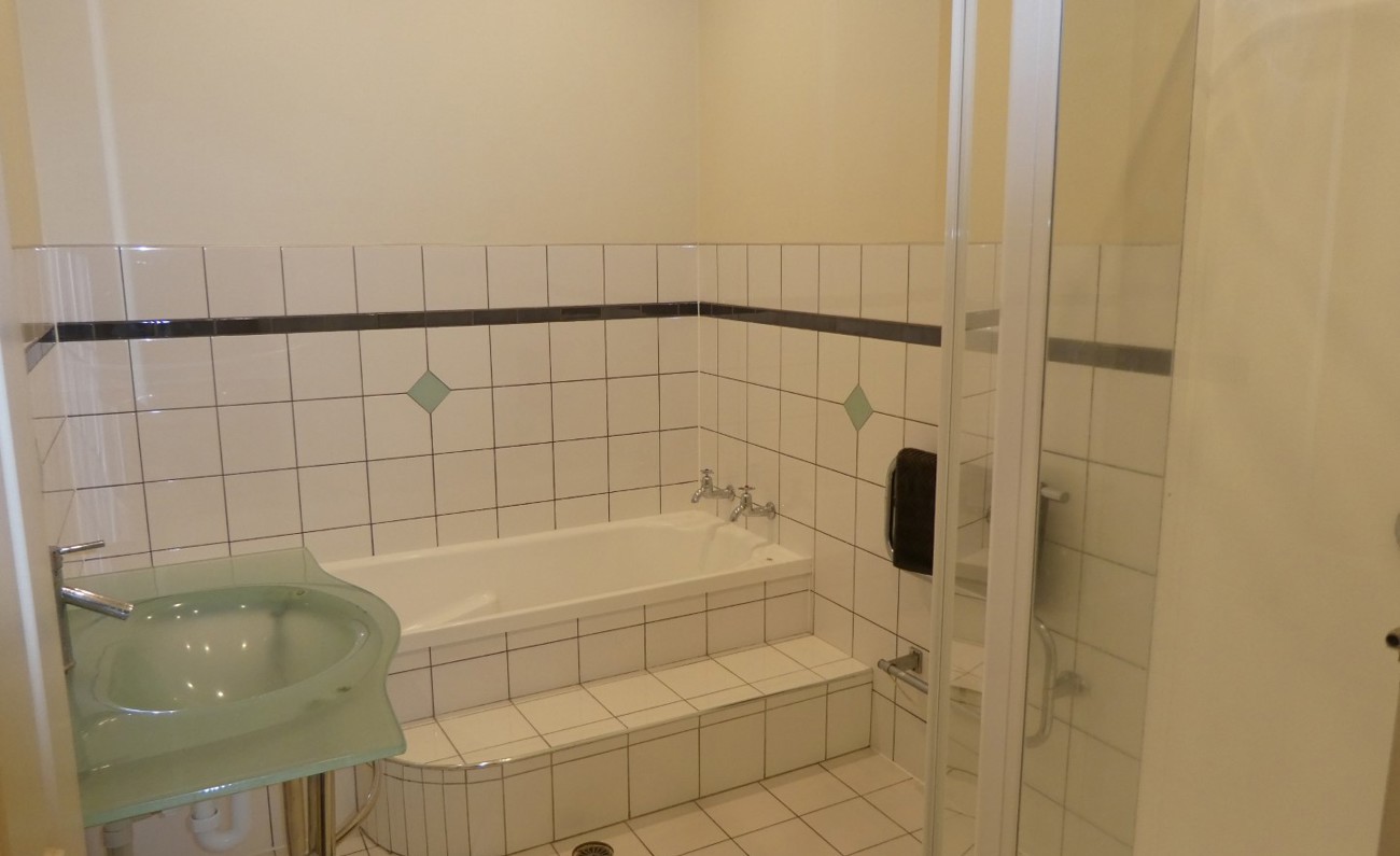 Bathroom on tiled floors along with half tiled walls and has a bath with tiled step-up, shower, vanity, toilet and heated towel rail.