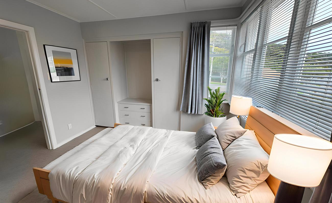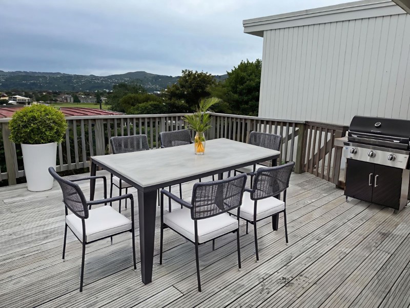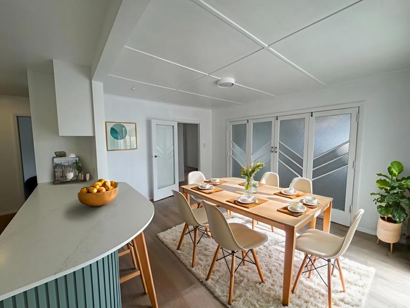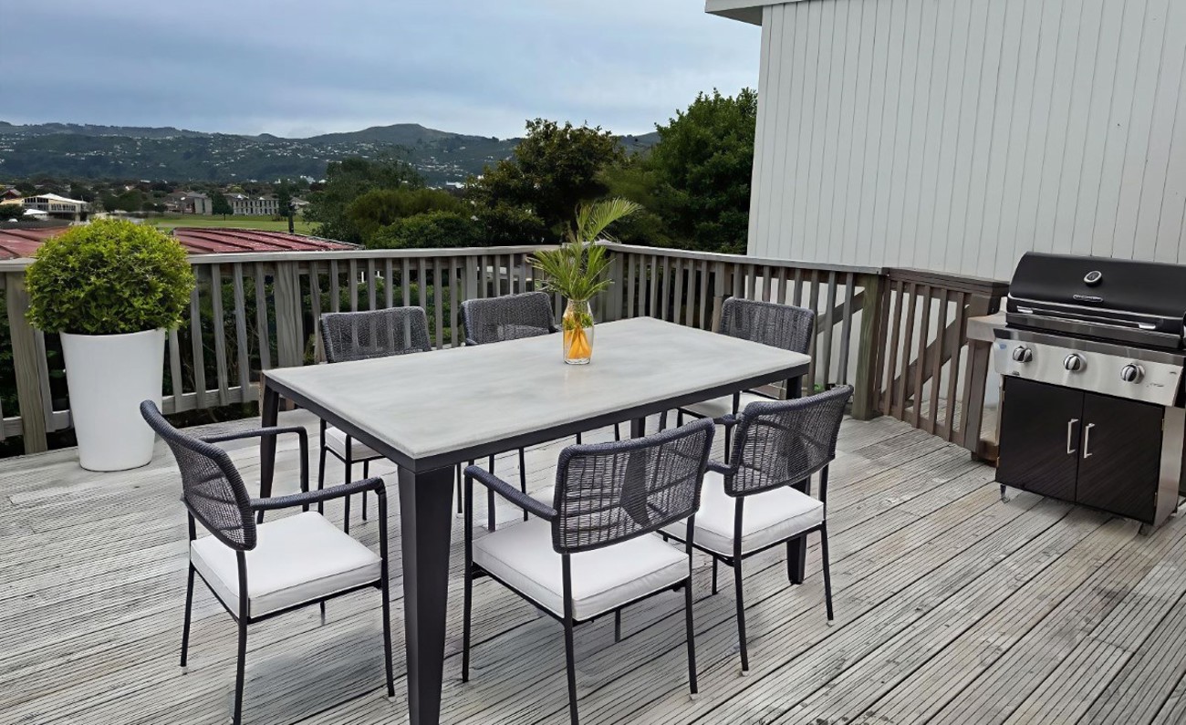 The huge semi-covered deck is the highlight, overlooking the park and hills — perfect for weekend breakfasts, summer barbecues, or evening drinks, rain or shine. Inside, the open-plan kitchen, dining and living area flows seamlessly to the deck, creating a warm, social space for entertaining.