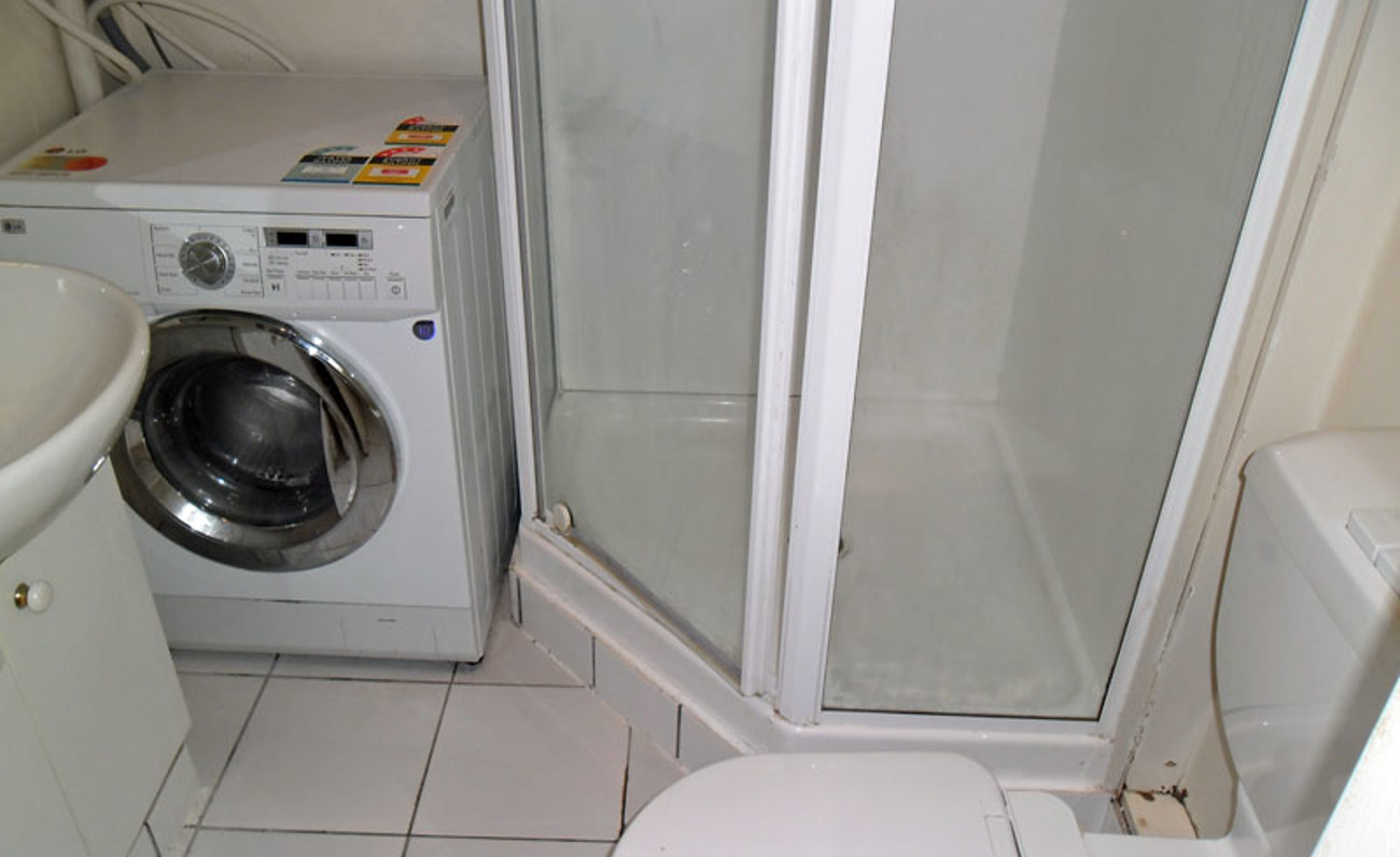 The combined bathroom and laundry is modern and practical, featuring a shower with a shower dome, vanity, toilet, and a combination washer/dryer, making efficient use of space without compromising on comfort.
