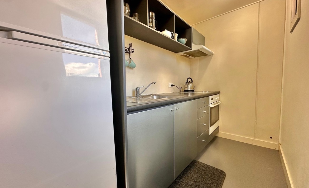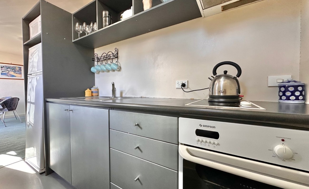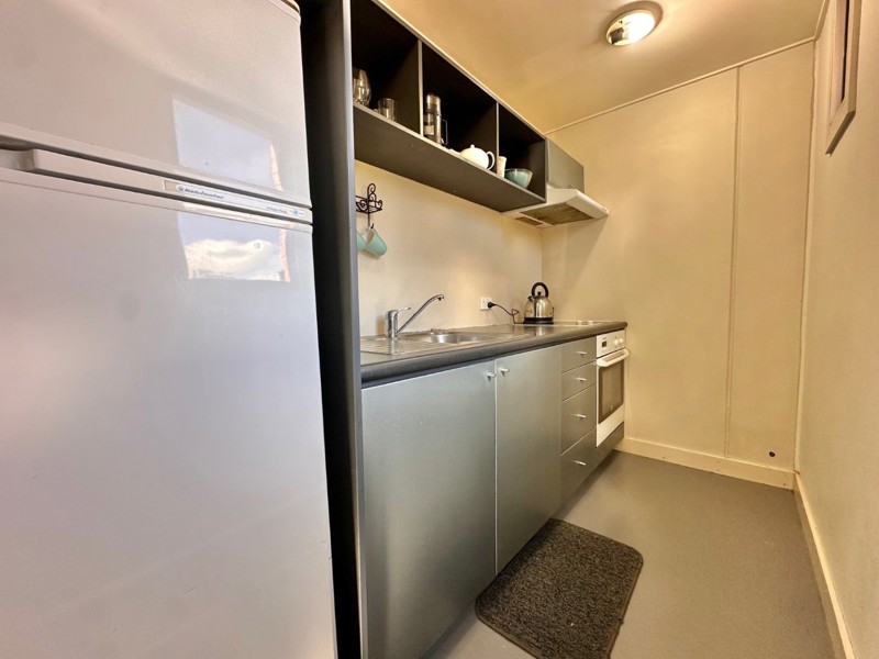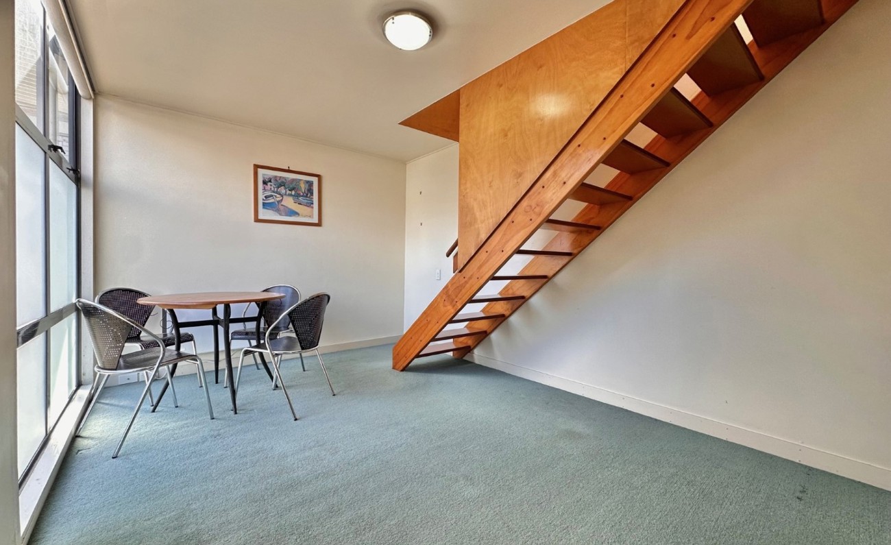 This apartment is split over two levels, on the bottom level includes open plan living/dining area with a wall heater and an adjacent galley kitchen.